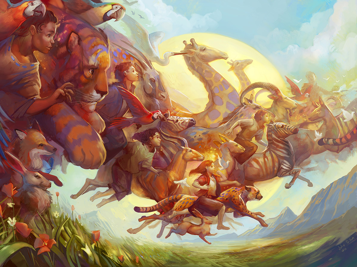 When given the choice, I definitely prefer to do something more hopeful overall. There is enough cynicism in the world as it is, and I want to try to make sure that I’m putting positive things out into the world instead of adding to the cynicism. When I do draw something darker or sadder or violent, I try to have a thematic or narrative purpose, and not make something dark just for the sake of being dark. There is nothing wrong with that, it’s just not what I personally like to do when left to my own devices. My favorite SFF stories and films have always been ones that uplift and fill you with wonder. Dark, gritty, dystopian settings just aren’t my thing. When I was first starting out, most of my commissioned work assignments were for gaming and called for depictions of warriors and monsters killing each other. That definitely can be fun, to an extent, but after a while I wanted to spend more time drawing people working together, people being happy, people exploring and discovering new things, and doing things other than fighting each other. I wanted to work towards painting what I wanted to see, instead of just what looked cool.