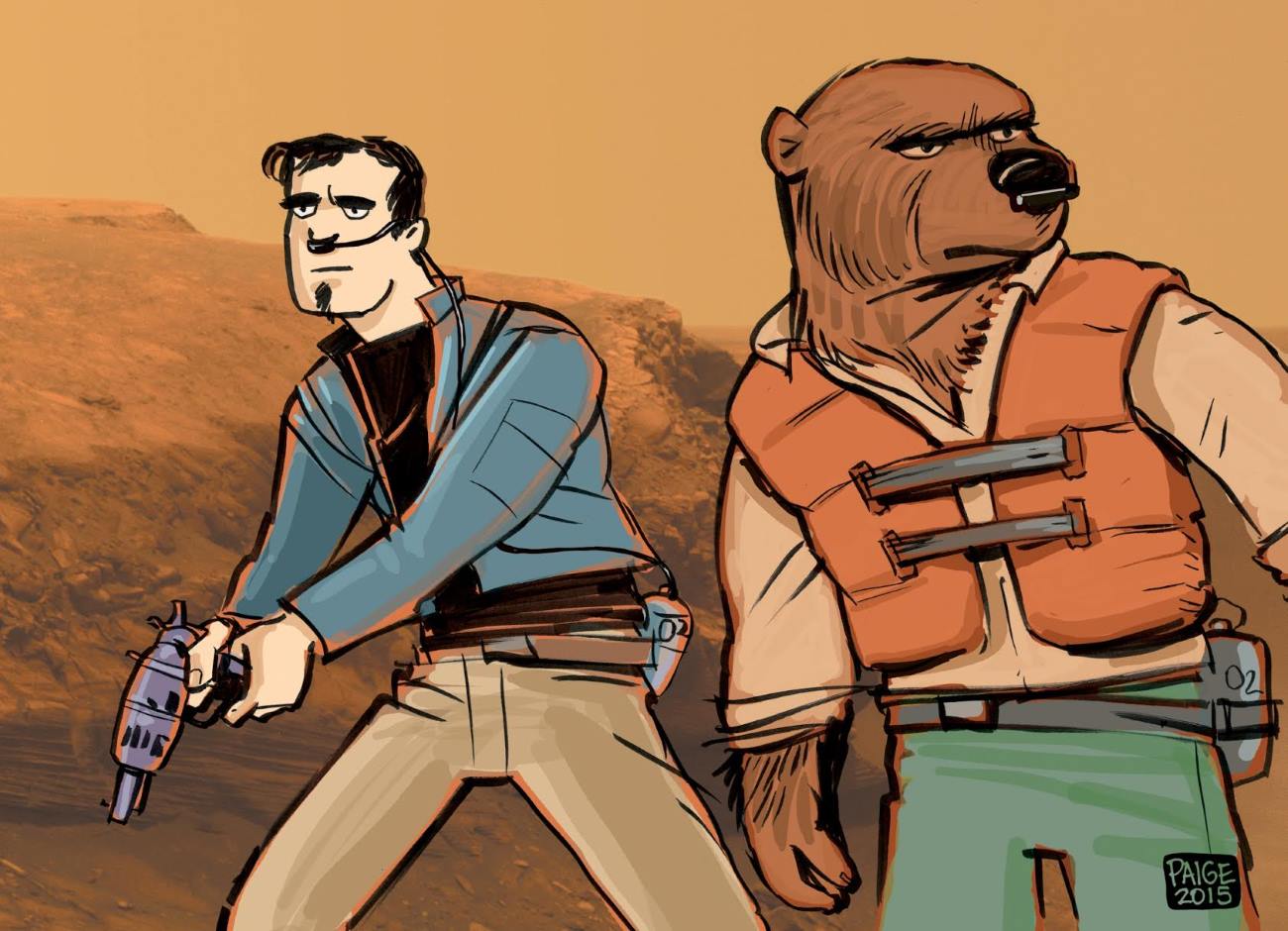 Paige Braddock, illustrator of “Emergency Repair” by Kate M. Galey: I’ve been working as an illustrator since 1985. I started out doing feature illustration for newspapers, back in the day, and eventually ended up transitioning to licensing in 1999. I’ve always been interested in adventure comics and science fiction stories, so this project was particularly fun because it allowed me to blend both of those things. In my day job, I oversee licensing for the Peanuts comic strip. My “night” job is writing and illustrating my other graphic novel projects: Jane’s World and Stinky Cecil . . . oh, and this comedy sci-fi graphic novel titled The Martian Confederacy, written by Jason McNamara.